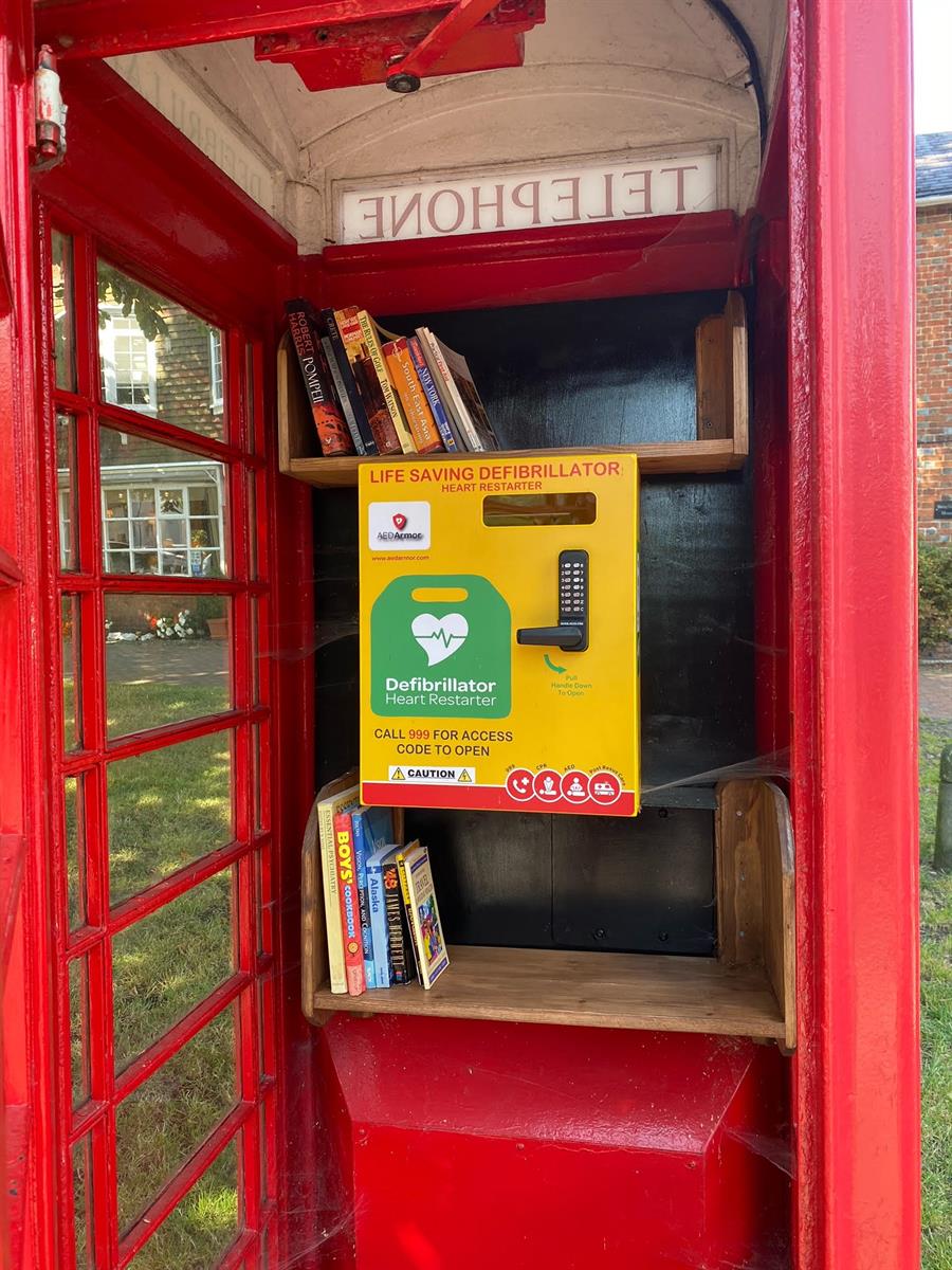 One of our councillors has very kindly put up some shelving in the telephone box on the Green, which also houses the defibrillator.